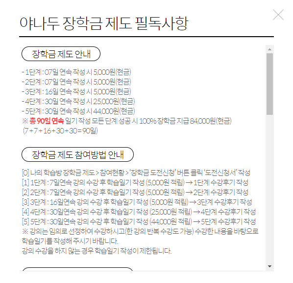 야나두 장학금은 5단계를 완료 시 84,000원의 장학금을 지급한다.